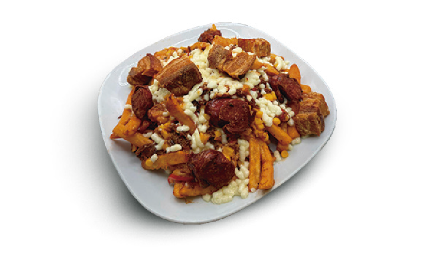 Combinación de Carne y Pollo Desmechado, Chorizo, Chicharrón, Bacon, Maicitos.